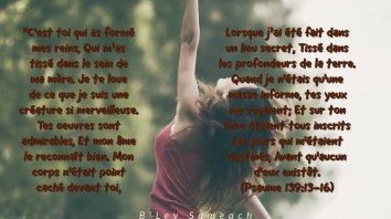 Waouh!  Lorsque j’ai lu, « J’ai fait de toi une créature merveilleuse. »(Psaume 139.14), j’ai eu l’impression que des liens se brisaient en moi.  Mon approche de la vie a changé du jour au lendemain parce que j’ai compris qu’il n’y avait absolument rien d’anormal chez moi. De surcroît, si l’Éternel, le créateur de l’univers, CELUI qui m’avait créée, me disait que j’étais une créature merveilleuse, que me valaient donc les opinions des uns et des autres, peu importe qu’il s’agisse parfois de proches?  J’ai alors commencé à réellement vivre pour moi, à m’autoriser à être moi, à m’épanouir. Ça a été un long chemin ardu où les voix de mes critiques se faisaient encore entendre parfois et les doutes prenaient le dessus. Cependant, je n’ai jamais dévié de la trajectoire prise: celle de l’authenticité.